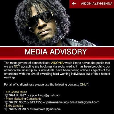 The management of dancehall artiste Aidonia has released the above mention media advisory.