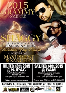 Jammins Entertainment presents 2 days, 2 states, 3 stars and a show to remember. New Jersey in association with RoadBlock Radio and NJPAC the star studded concert will take place on Friday, February 13th, 2015 at NJPAC (New Jersey Performing Arts Center), and on Valentine's day Saturday, February 14th at BAM (Brooklyn Academy of Music). Music lovers will sway to the sounds of Shaggy's hits such as "It Wasn't Me", "Angel", "Oh Carolina", "Strength of a Woman", Maxi Priest "Close To You", "Housecall", "Wild World", :Just a Little Bit Longer" and Sanchez "Loneliness Leave Me Alone" as well as his classic and unique reggae renditions of love songs covers.